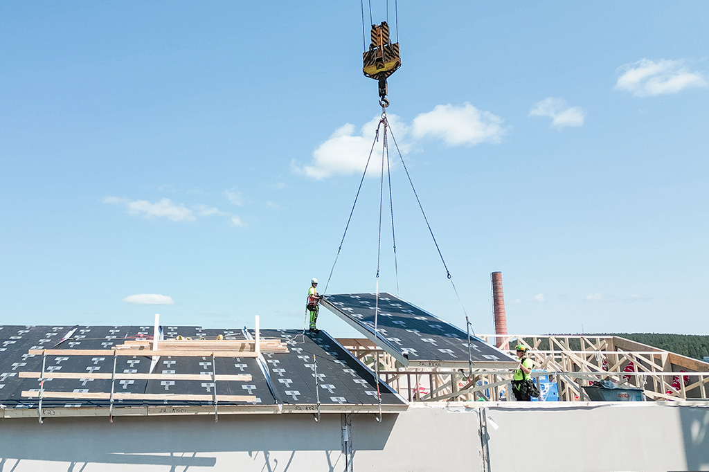 Valmiit kattoelementit nostettaan paikoilleen ja katto alkaa valmistumaan nopeasti. Suurkattoelementit toimitetaan viimeisenä pintanaan alushuopa, jolloin rakennus on heti säältä suojassa.