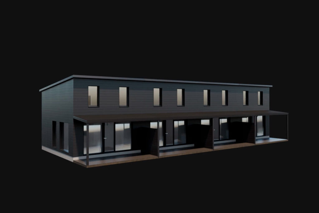 Rakennusaika lyhenee merkittävästi, kun elementtirakentamista ja moduuleja yhdistelemällä rivitalo saadaan säältä suojaan nopealla aikataululla.
