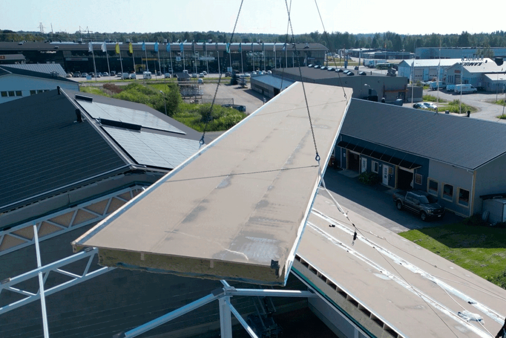 Lämmin suurkatto soveltuu suurten kattopintojen rakentamiseen, kuten teollisuus- ja liikerakennuksíin. Elementin 60 m2 maksimikoko nopeuttaa asennusta ja rakennus saadaan nopeasti säältä suojaan sekä lämpimäksi.